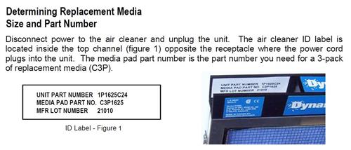 NOTE: Replacement filter media is NOT ordered based upon the dimensions of the media. Do not measure the Pad itself , replacement pads are ordered based on the panel size...the outside dimensions of the aluminum and plastic filter frame. To make sure you order the correct replacement filter media you will need to get the part number from the white sticker located inside the edge frame of the air cleaner.